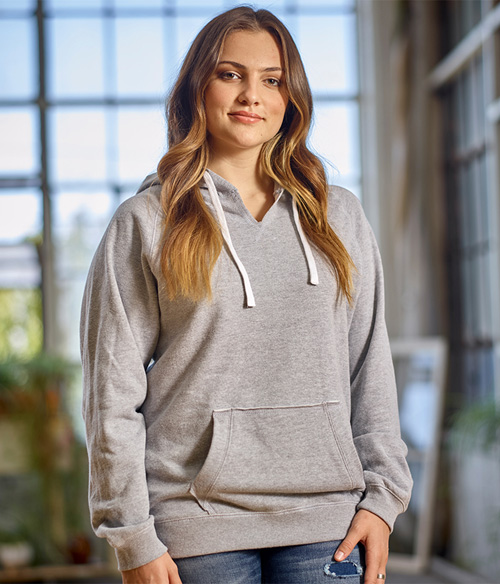 - Hood and pocket have raw fabric edges